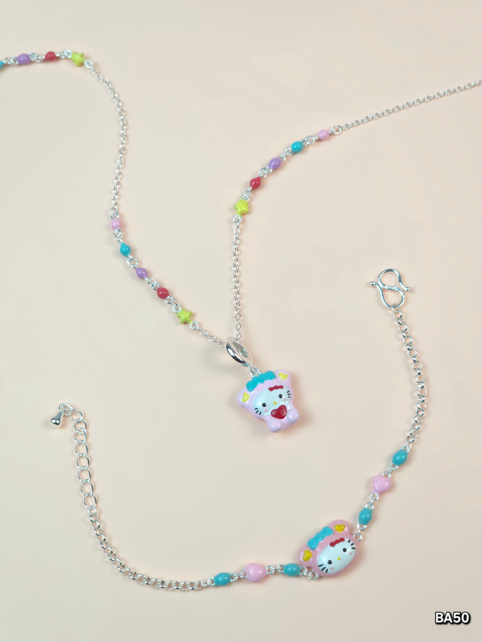 Dây chuyền cũng được làm từ bạc, với thiết kế tinh tế và tương tự lắc tay. Phần dây được điểm xuyết bởi các hạt nhựa tròn nhỏ nhiều màu sắc như đỏ, hồng, xanh lá, tím và xanh dương. Mặt dây chuyền hình chú mèo nhỏ xinh, với tông màu trắng chủ đạo và các họa tiết hồng, xanh, vàng, mang lại vẻ ngoài vui vẻ và ngộ nghĩnh.