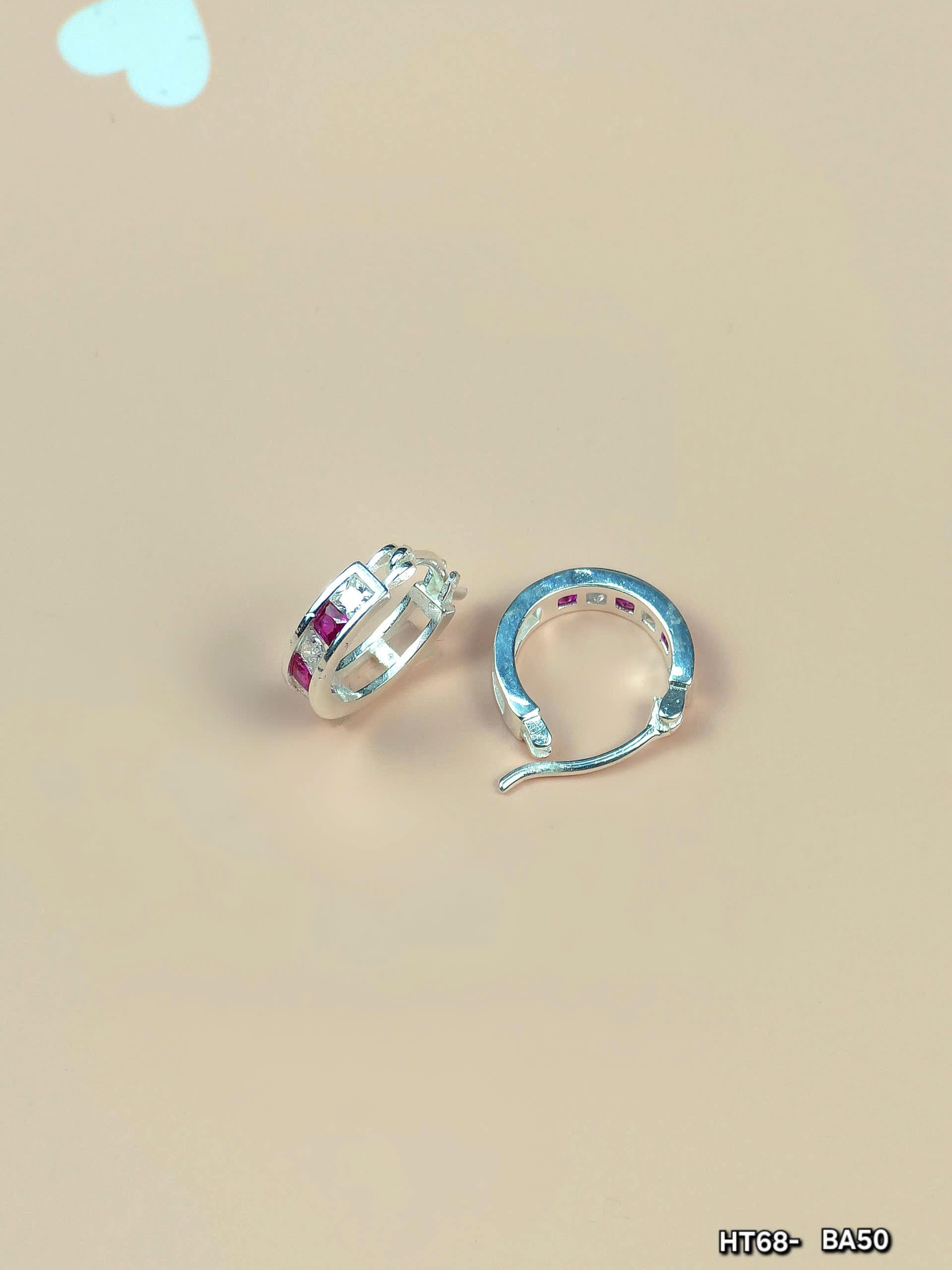 Đôi bông tai có thiết kế vòng tròn cổ điển với kiểu khóa dễ dàng tháo mở. Bề mặt bạc sáng bóng được tô điểm bằng các viên đá nhỏ màu đỏ, tạo nên sự nổi bật trên nền bạc sáng. Những viên đá đỏ này không chỉ là điểm nhấn thẩm mỹ mà còn tượng trưng cho sự may mắn và niềm đam mê rực cháy.