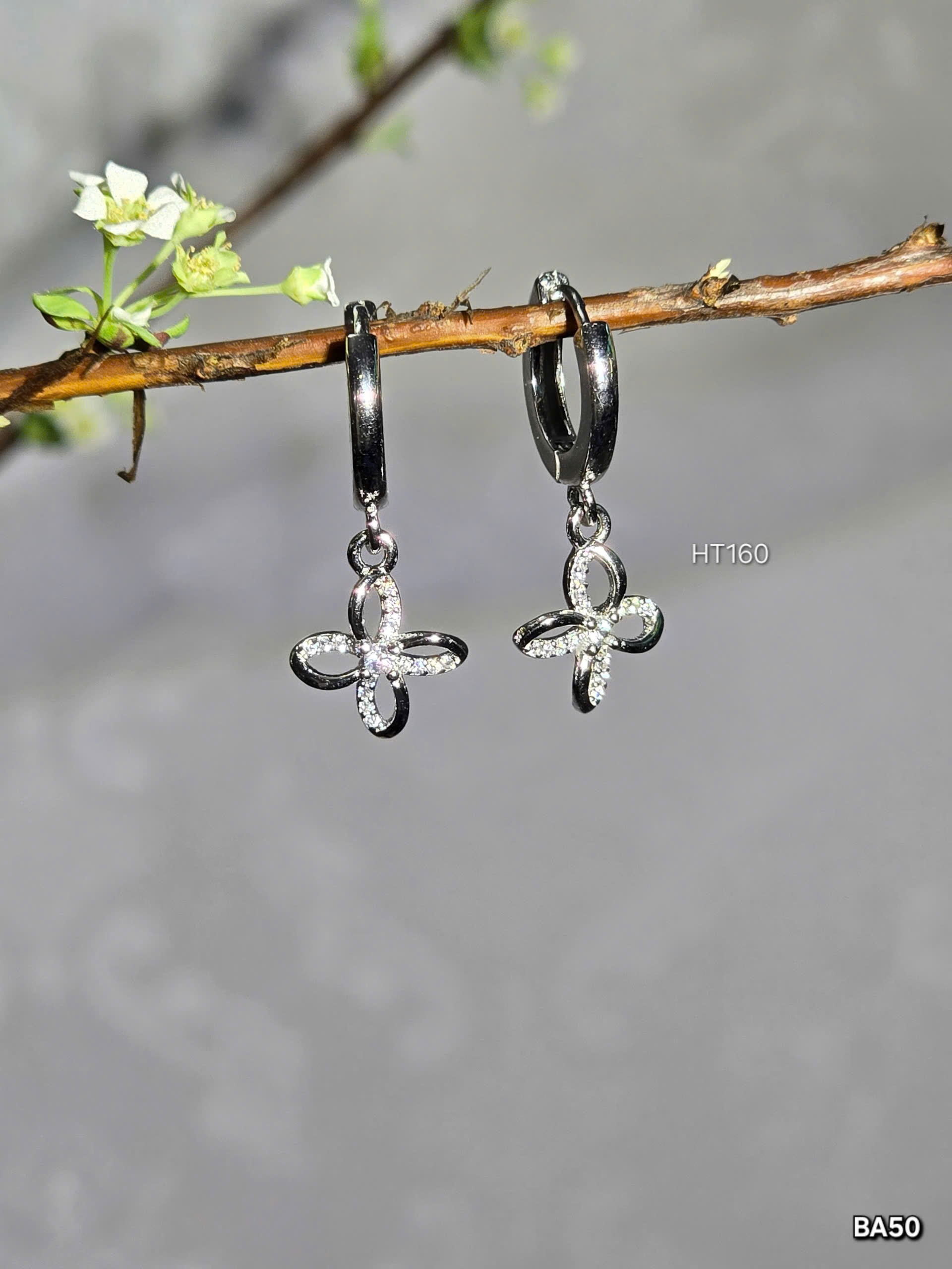 Bông tai bạc xi kim là sự kết hợp hoàn hảo giữa sự thanh lịch và sang trọng. Thiết kế tinh xảo với phần khuyên tròn nhỏ, ôm sát dái tai, mang lại cảm giác thoải mái khi đeo. Phần mặt dây treo được cách điệu thành hình hoa bốn cánh, mỗi cánh hoa được đính kín bởi các viên đá lấp lánh, có thể là đá Swarovski hoặc đá trắng nhân tạo, tạo nên vẻ đẹp quyến rũ và tinh tế.