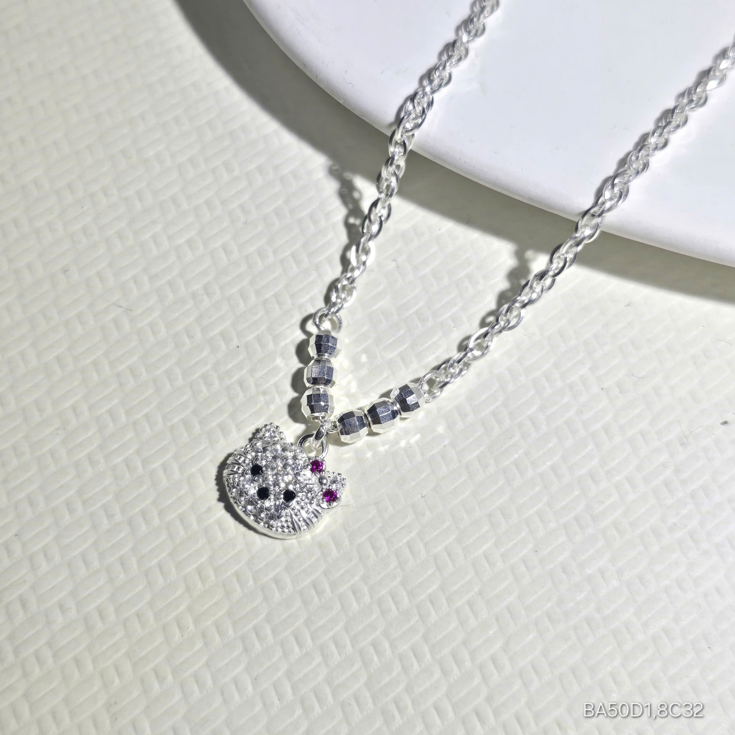 Khám phá dây chuyền bạc liền mặt hình mèo Hello Kitty đính đá lấp lánh, sang trọng và đáng yêu. Phù hợp làm quà tặng ý nghĩa.