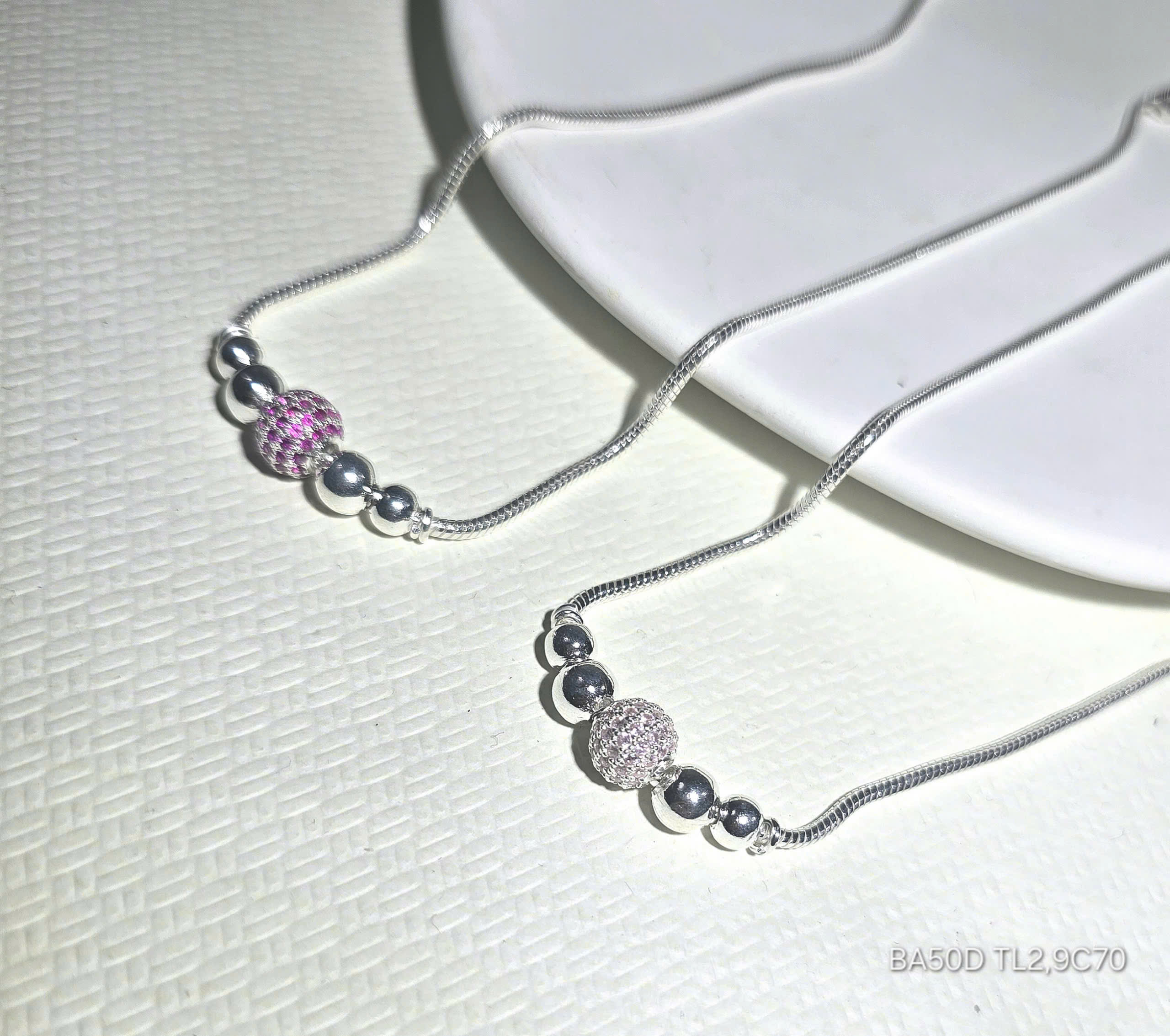 - Hạt tròn lấp lánh: Mặt dây chuyền được trang trí bằng 5 hạt tròn bạc, trong đó hạt trung tâm lớn hơn, phủ đá màu hồng tím hoặc trắng bạc, tạo điểm nhấn ấn tượng.