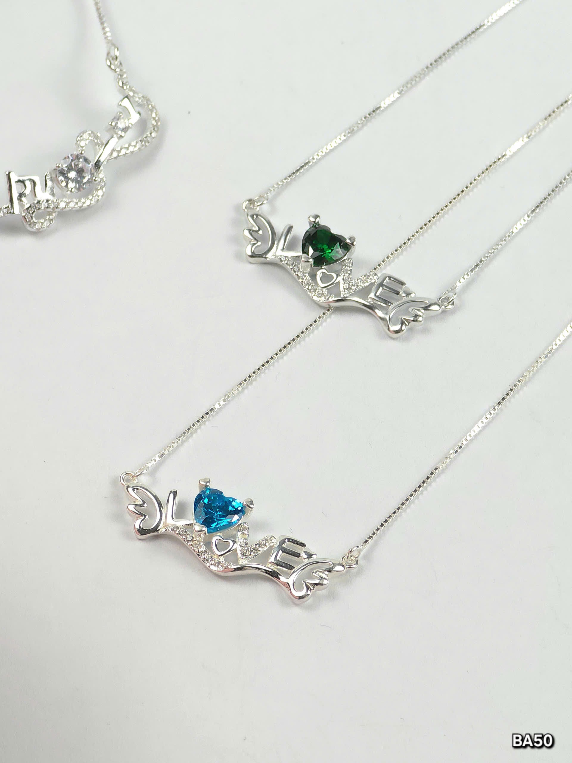 Mặt dây chuyền là điểm nhấn đặc biệt với chữ “LOVE” được cách điệu tinh xảo. Chữ “O” và “V” được trang trí bằng đá quý lấp lánh, trong đó chữ “V” nổi bật với viên đá hình trái tim màu sắc rực rỡ. Mỗi mẫu dây chuyền có màu đá khác nhau, từ trắng trong suốt đến xanh lá, mang đến sự lựa chọn đa dạng cho phái đẹp.
