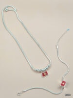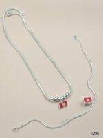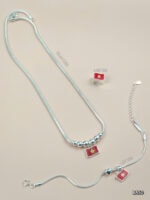 Bộ trang sức bạc gồm dây chuyền và lắc tay được thiết kế tinh xảo, kết hợp charm hình lá cờ Việt Nam, mang đậm bản sắc dân tộc. Sản phẩm làm từ bạc cao cấp, sáng bóng và bền đẹp theo thời gian.