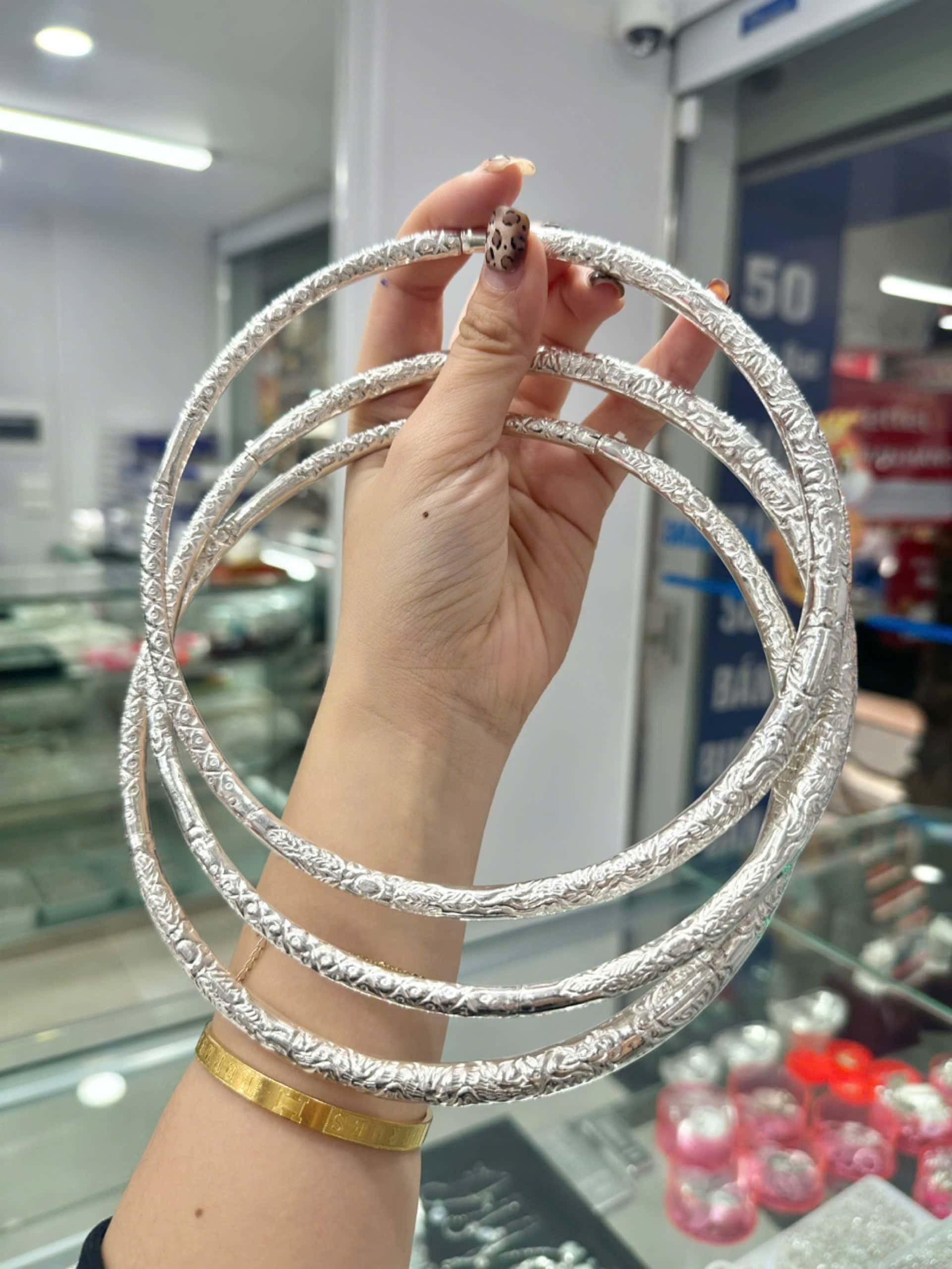 Kiềng bạc S99 chạm khắc hoa văn tinh xảo, thiết kế tròn thanh mảnh, sáng bóng. Phù hợp với mọi dịp trang trọng. Mua ngay tại bacvn.com!