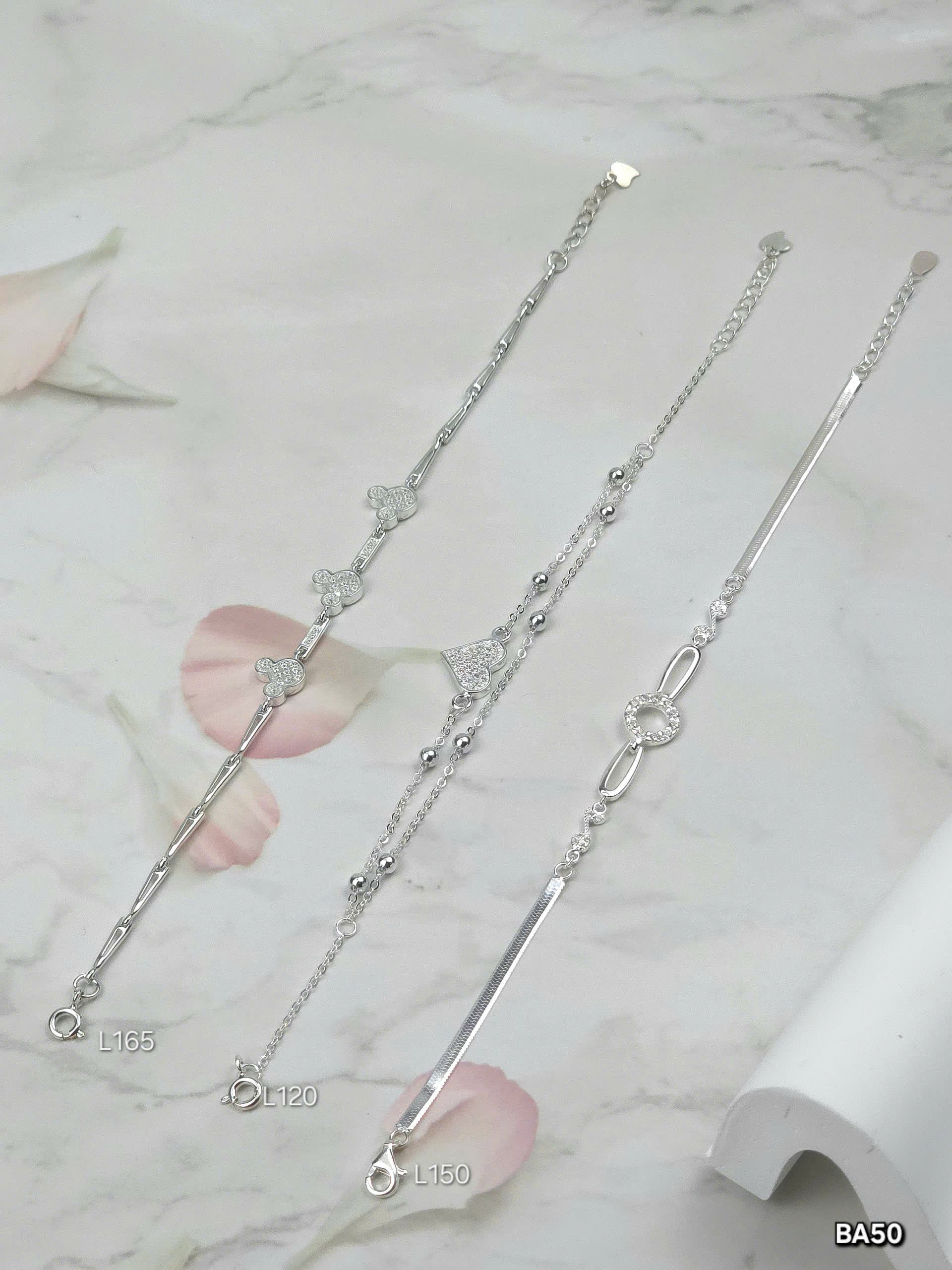 - Mẫu L165: Với thiết kế dạng chuỗi mắt xích thanh dài, lắc tay này tạo nên sự mềm mại và nữ tính. Ba mặt hoa đính đá nhỏ lấp lánh là điểm nhấn bắt mắt, phù hợp với những ai yêu thích phong cách nhẹ nhàng.