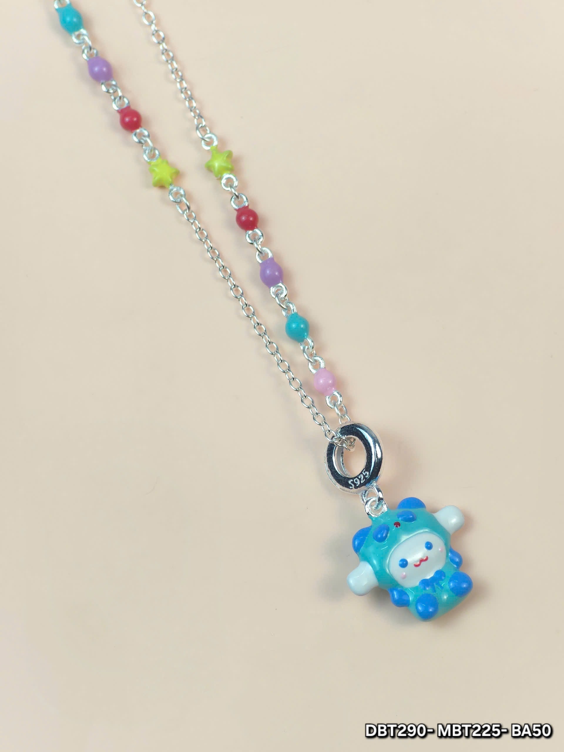 Mặt trang trí là điểm nhấn đặc biệt của chiếc lắc, với hình ảnh nhân vật hoạt hình dễ thương, mặc bộ đồ hóa trang xanh dương và đôi tai thú ngộ nghĩnh. Chi tiết này không chỉ làm tăng thêm vẻ đáng yêu mà còn kích thích trí tưởng tượng của trẻ.