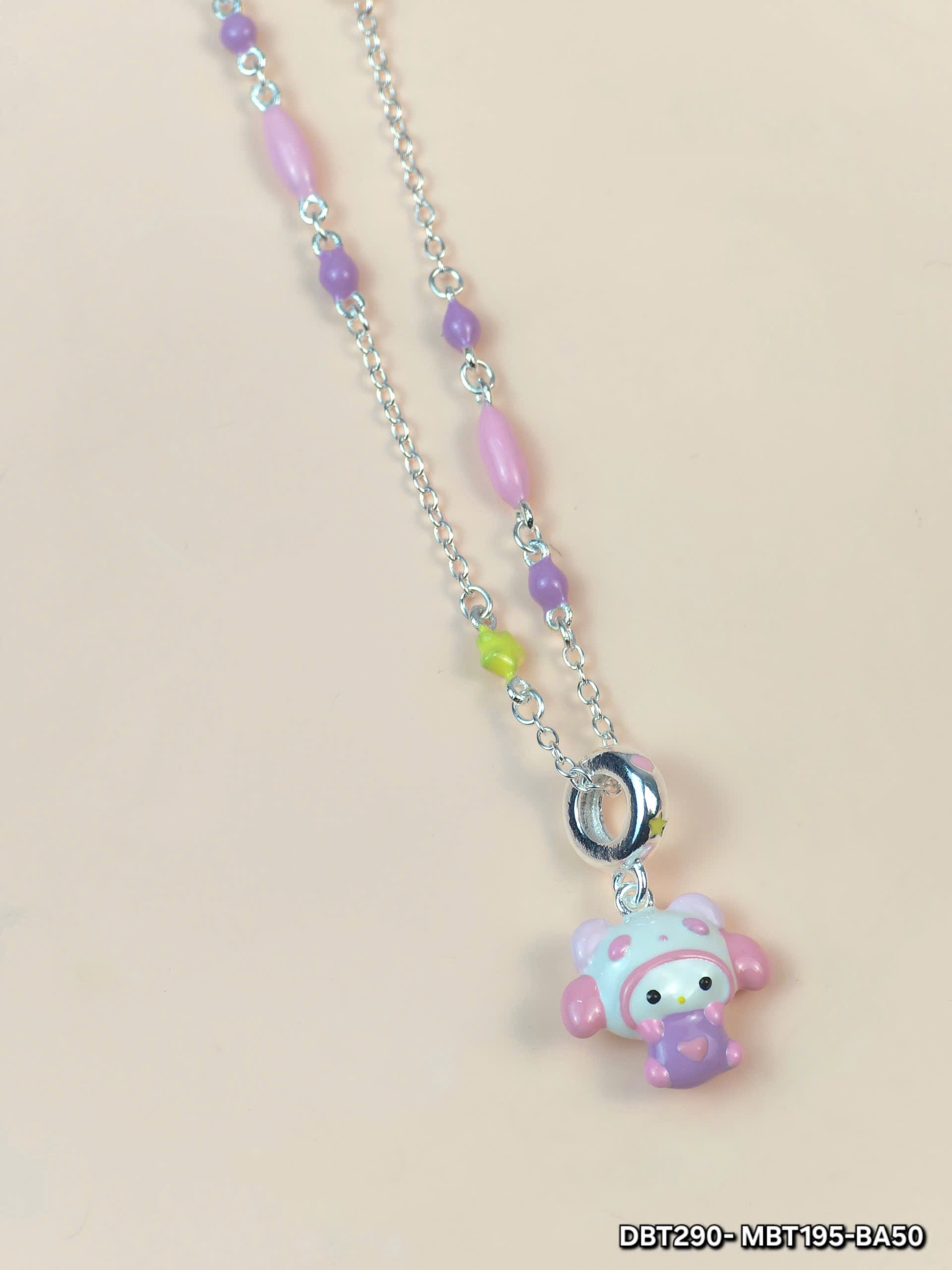 Mặt dây là hình ảnh một chú gấu hoạt hình dễ thương, đội mũ màu hồng và tím pastel, khuôn mặt mỉm cười đáng yêu. Chi tiết mũ và quần áo được thiết kế tỉ mỉ, mang đến sự ngộ nghĩnh và vui tươi. Sản phẩm phù hợp với các bé gái, là món quà ý nghĩa trong các dịp đặc biệt như sinh nhật, ngày lễ.