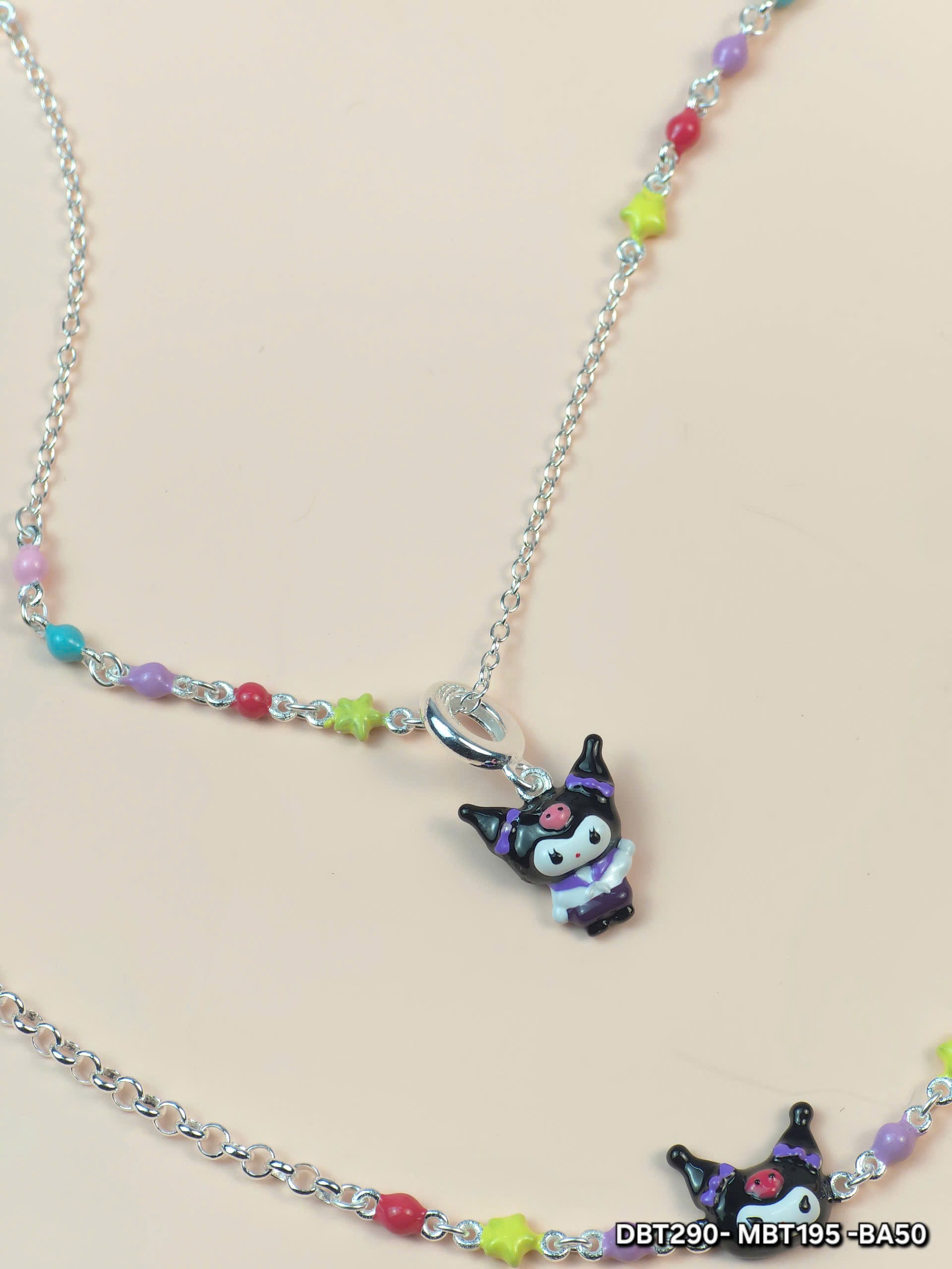 Đặc biệt, lắc tay còn được trang trí bởi mặt dây chuyền nhỏ có hình nhân vật hoạt hình Kuromi. Với những đường nét chi tiết và dễ thương, Kuromi được tạo hình với tone màu chủ đạo là đen và tím, kèm theo nơ màu hồng trên đầu, mang đến cảm giác tinh nghịch và đáng yêu. Chiếc lắc tay này không chỉ là món trang sức thời trang mà còn là người bạn đồng hành lý tưởng cho các bé trong mọi hoạt động vui chơi hàng ngày.