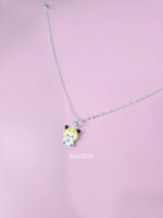 Thiết kế mặt dây chuyền: Mặt dây chuyền mô phỏng hình chú gấu hoạt hình với phần đầu tròn, tai đen nhỏ xinh, mũ vàng tươi và khuôn mặt dễ thương với đôi mắt tròn, má ửng hồng và mũi nhỏ màu đen. Phần thân được trang trí bằng các chấm bi đen, tạo cảm giác như bàn chân nhỏ.
