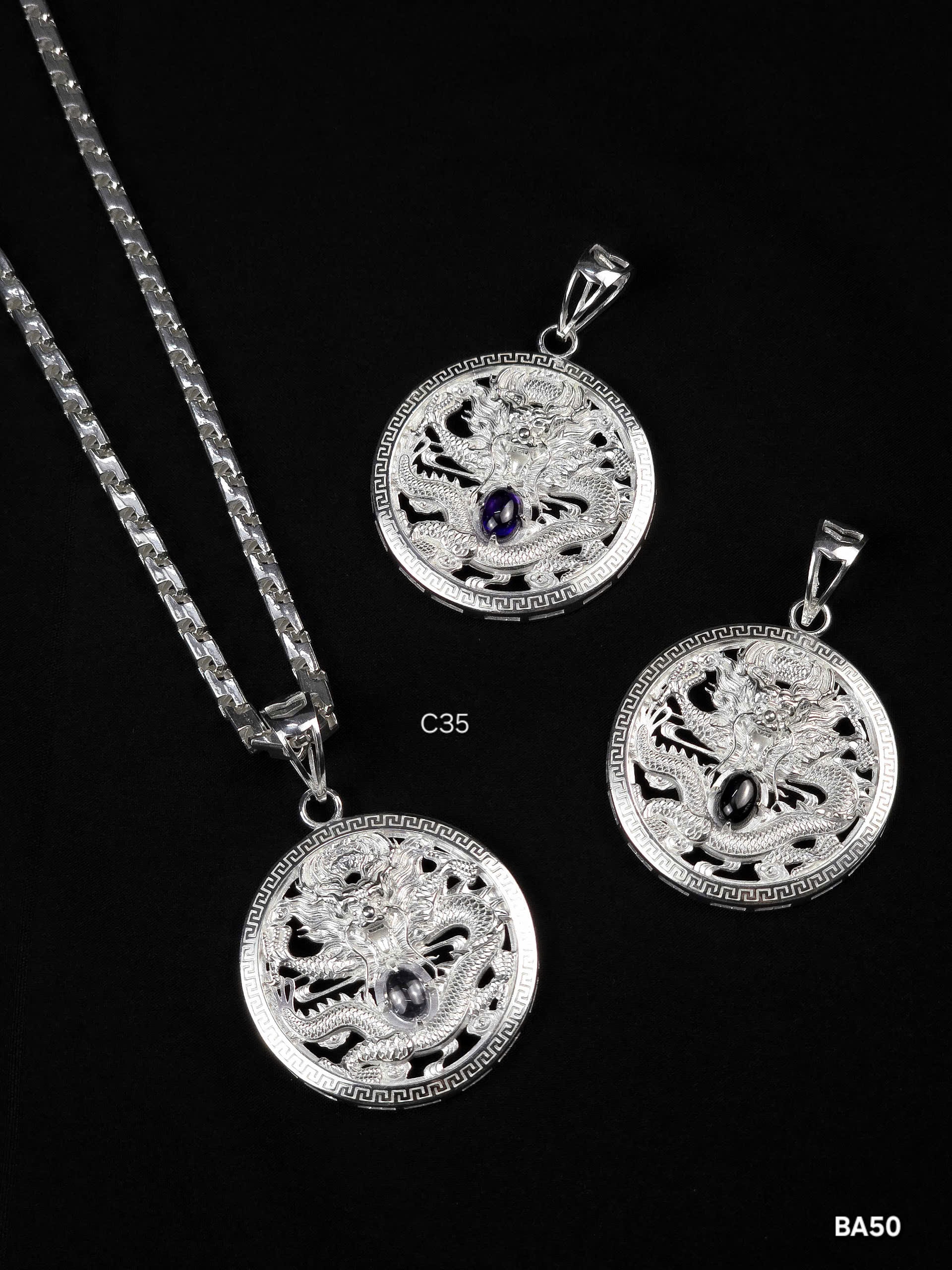 - Đính đá tím oval: Viên đá tím được đặt ở phần thân rồng, không chỉ tạo điểm nhấn mà còn làm nổi bật sự hài hòa giữa thiết kế bạc và đá quý.