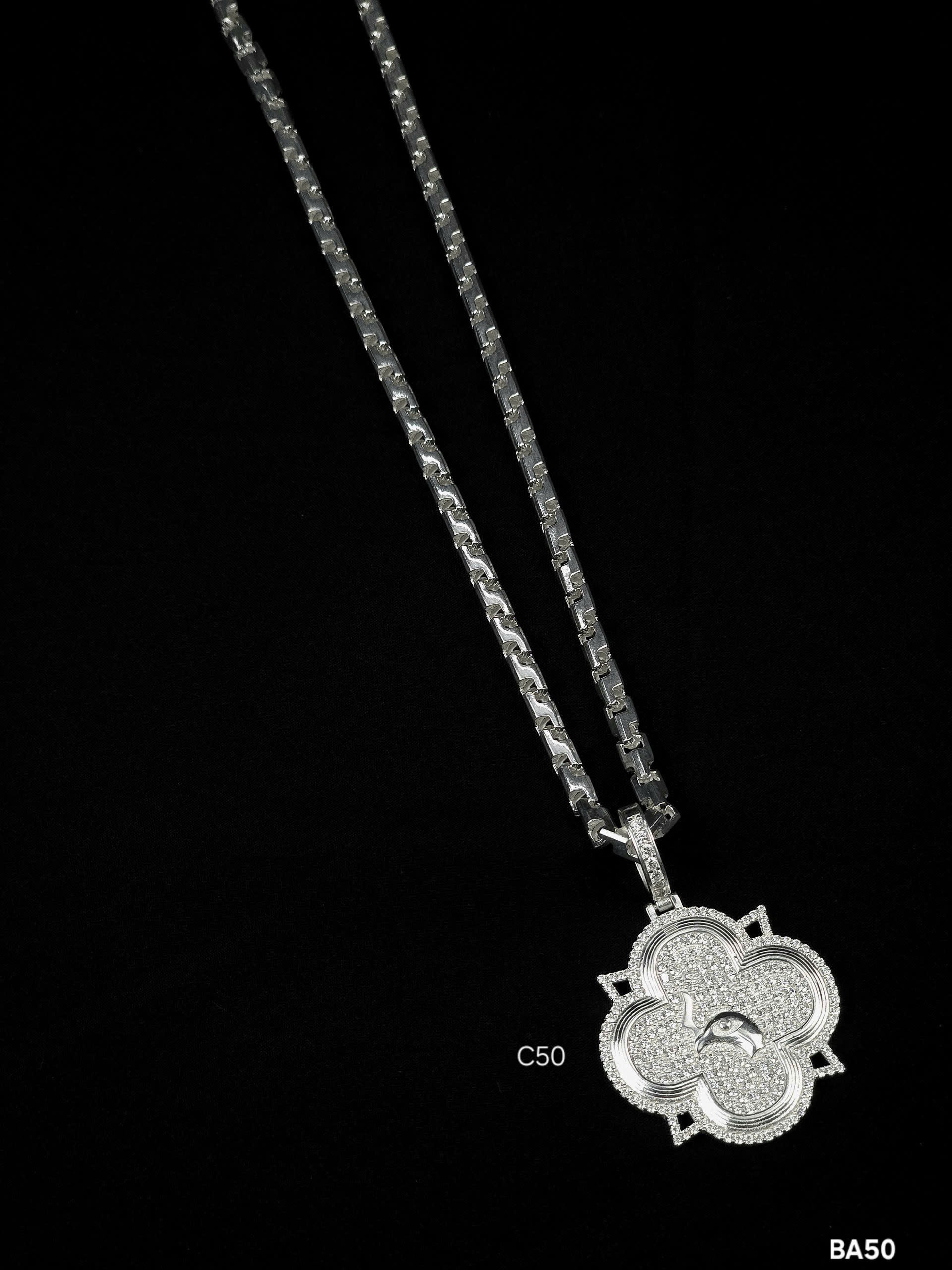 Sản phẩm được đặt trên nền màu đen, giúp từng chi tiết và sự lấp lánh của bạc nổi bật rõ ràng. Mặt dây chuyền và dây chuyền có các ký hiệu “C50” và “BA50”, thể hiện sự chuyên nghiệp và chất lượng cao. Đây là món quà ý nghĩa dành cho nam giới yêu thích phong cách cá tính và đẳng cấp.