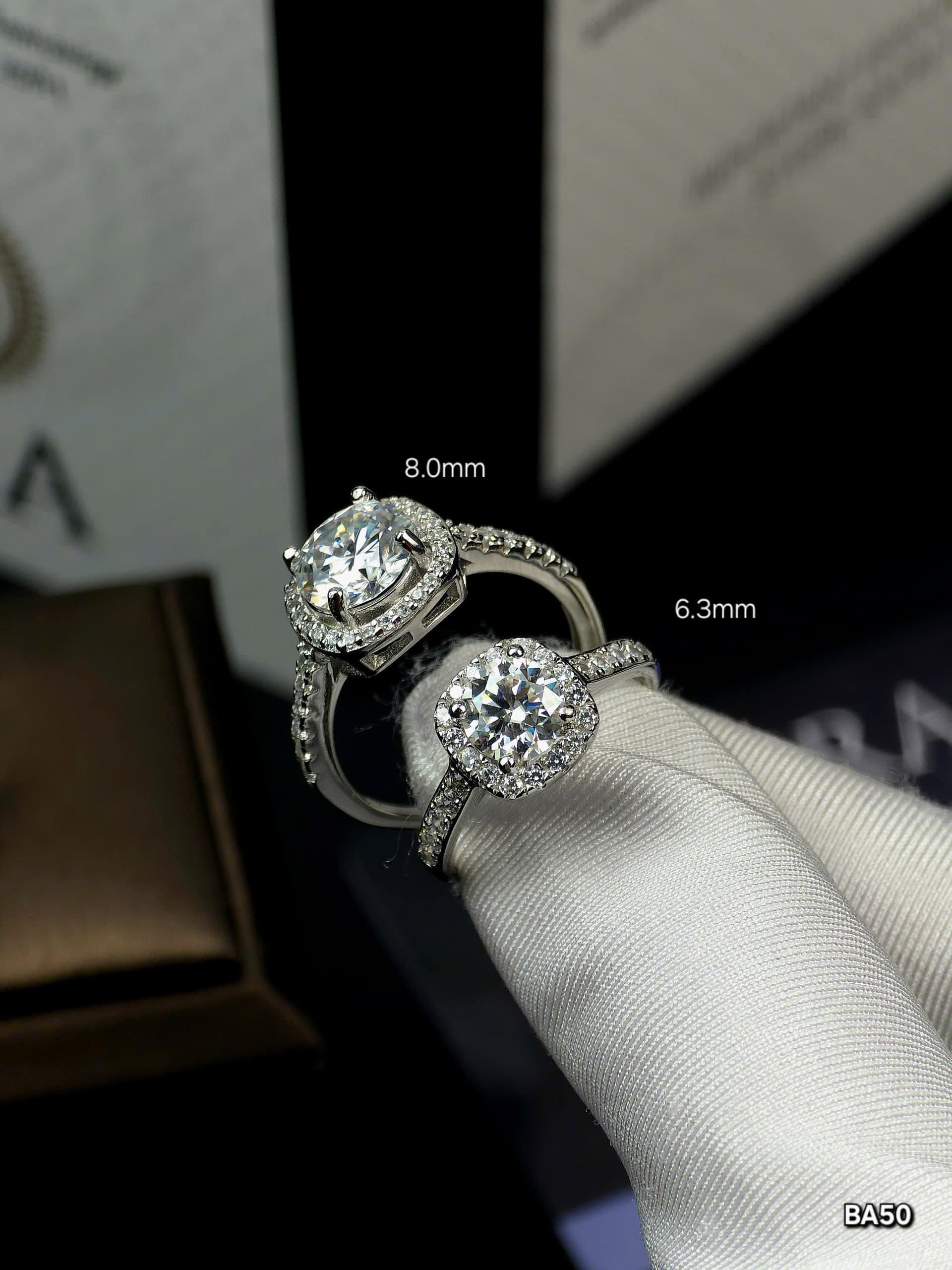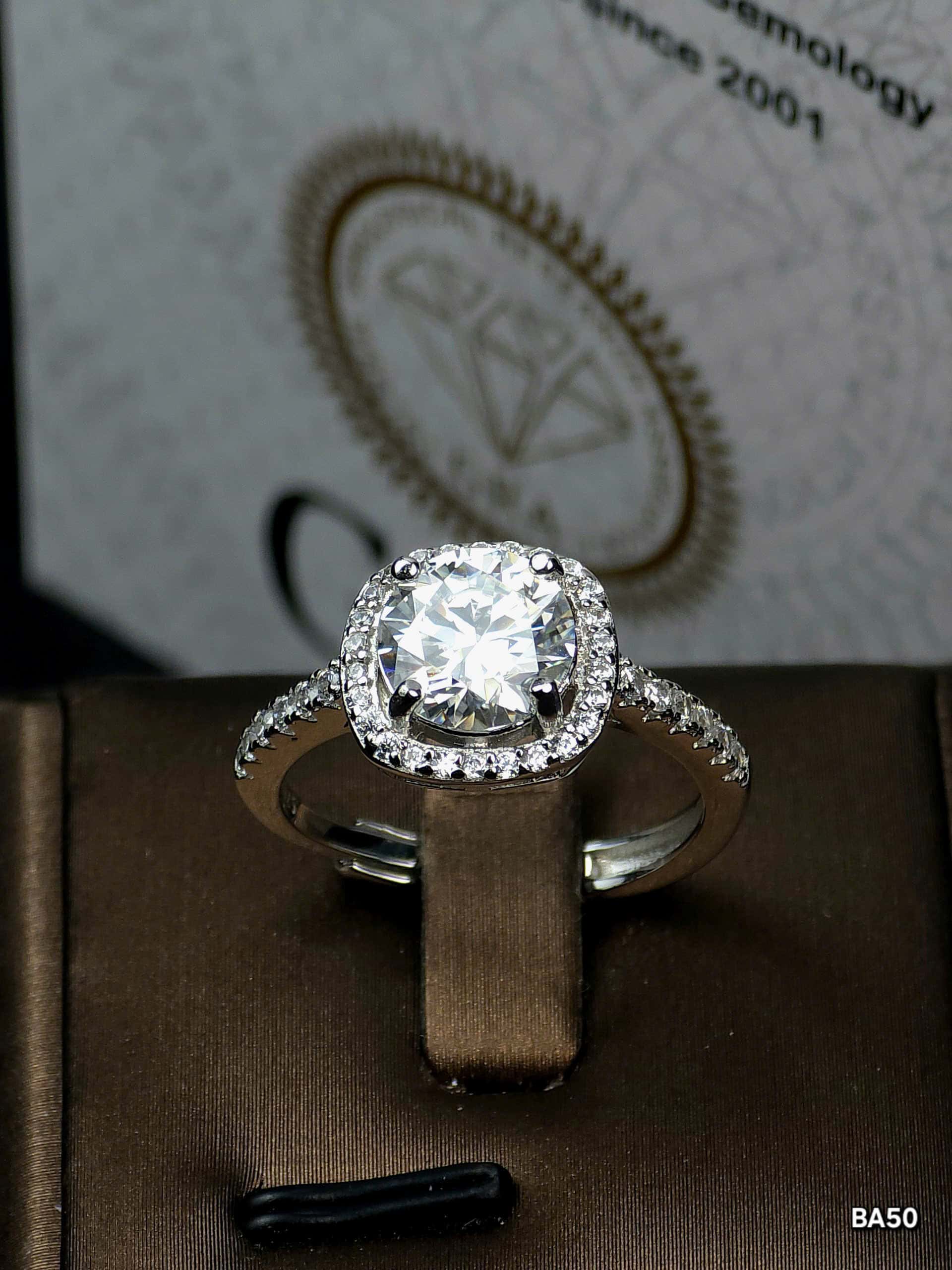 Chiếc nhẫn bạc đính đá lấp lánh này là sự kết hợp hoàn hảo giữa phong cách cổ điển và hiện đại. Với viên đá lớn ở trung tâm được cắt giác cẩn thận, chiếc nhẫn tạo hiệu ứng phản chiếu ánh sáng lung linh, thu hút mọi ánh nhìn. Bao quanh viên đá chính là một vòng đá nhỏ xếp đều đặn, tăng thêm sự lộng lẫy và giá trị thẩm mỹ cho trang sức.