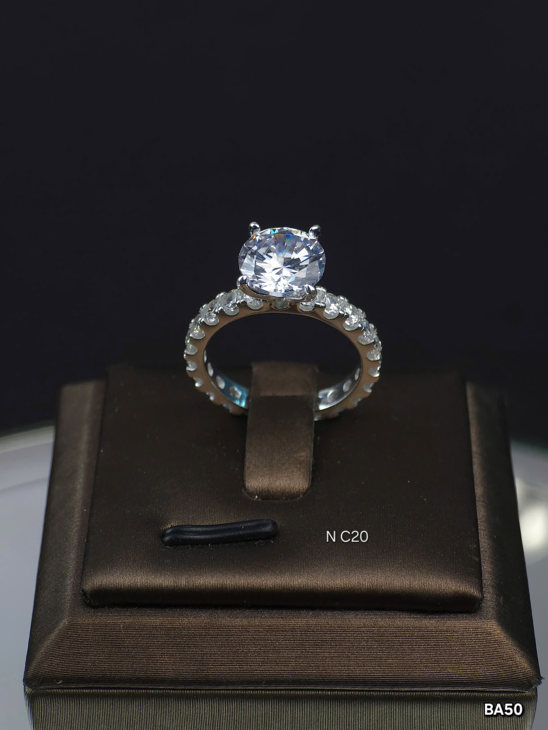 Chiếc Nhẫn Bạc Nữ Đính Đá Cao Cấp là một tác phẩm nghệ thuật tinh xảo, được thiết kế để tôn vinh vẻ đẹp và sự sang trọng của người phụ nữ hiện đại. Với viên đá quý lớn, tròn, lấp lánh được đặt ở trung tâm, chiếc nhẫn trở thành điểm nhấn quyến rũ và bắt mắt. Viên đá chính được giữ chắc chắn bởi bốn chấu bạc nhỏ, tạo sự an toàn và làm nổi bật sự rực rỡ của đá.