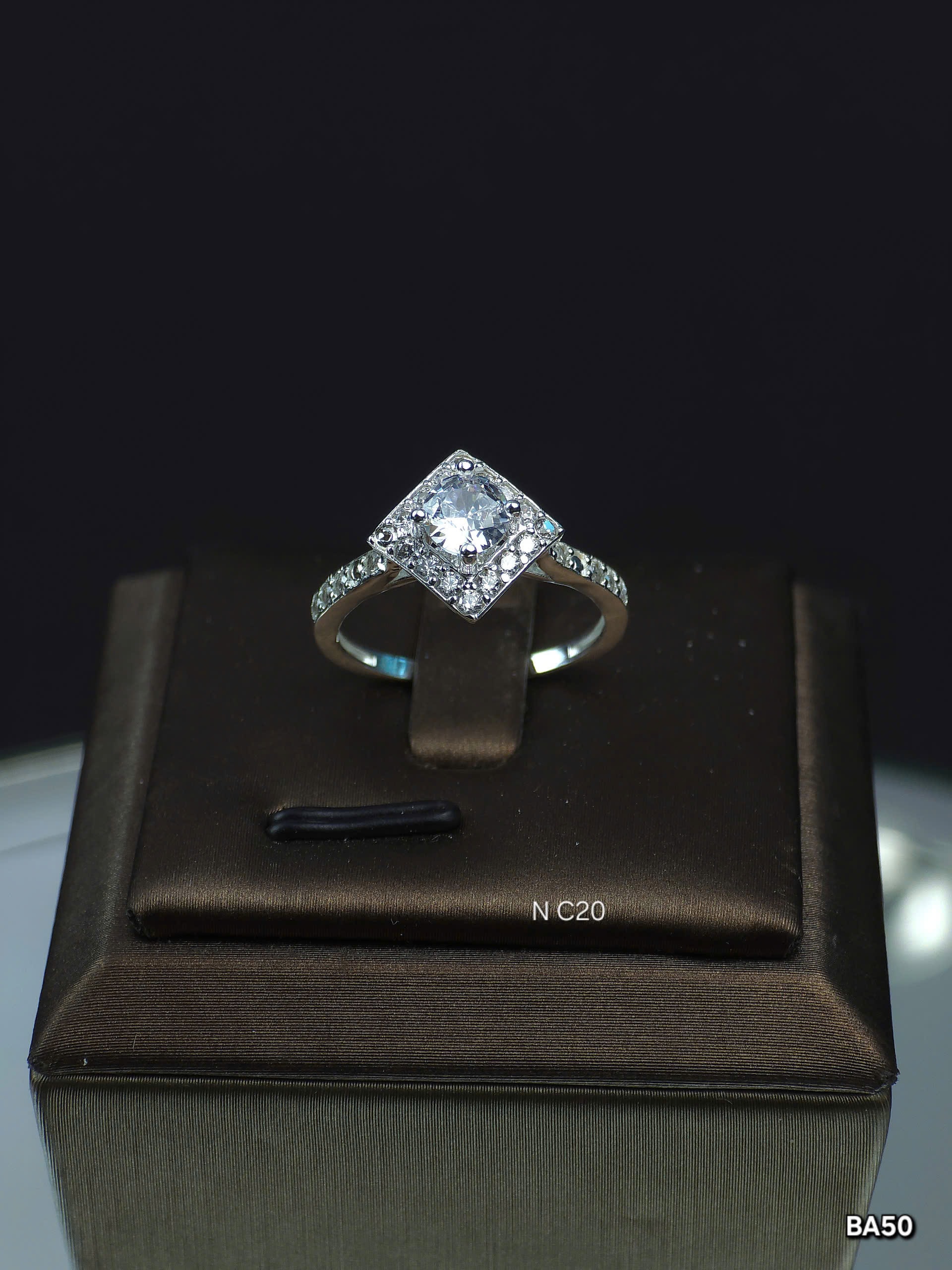 Chiếc nhẫn bạc nữ này là biểu tượng của sự thanh lịch và tinh tế, được chế tác từ bạc cao cấp mang đến vẻ đẹp tuyệt vời cho người sở hữu. Với thiết kế sang trọng, phần mặt nhẫn nổi bật với viên đá lớn hình tròn màu trắng trong suốt được bao quanh bởi một khung hình vuông đính những viên đá nhỏ lấp lánh. Kiểu dáng tổng thể tạo cảm giác cân đối và tinh xảo, rất phù hợp với những ai yêu thích phong cách thời trang nữ tính và đẳng cấp.