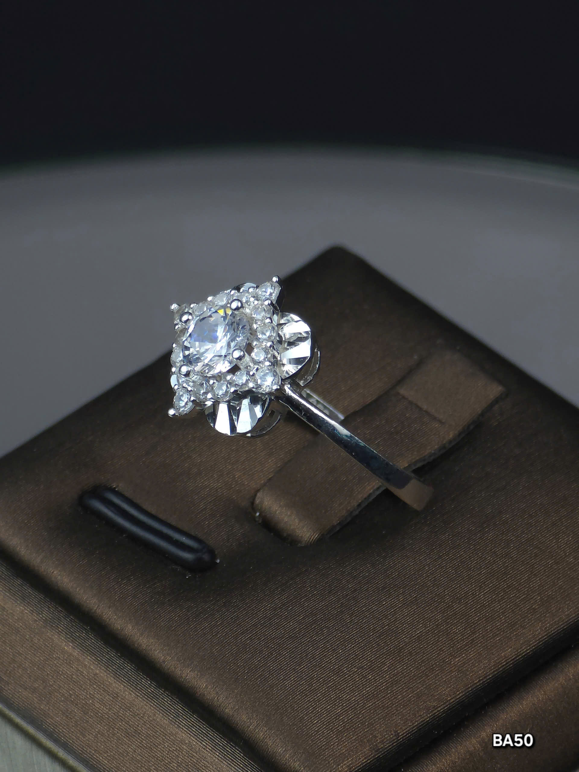 Chiếc Nhẫn Bạc Ý Đính Đá Lấp Lánh Sang Trọng là một tác phẩm nghệ thuật tinh xảo, mang đến vẻ đẹp quyến rũ và thanh lịch. Phần mặt nhẫn được thiết kế với một viên đá chính hình vuông mài giác, tạo độ lấp lánh ấn tượng. Xung quanh viên đá chính là một vòng các viên đá nhỏ hơn, được xếp đều tạo cảm giác như một bông hoa phát sáng lung linh.