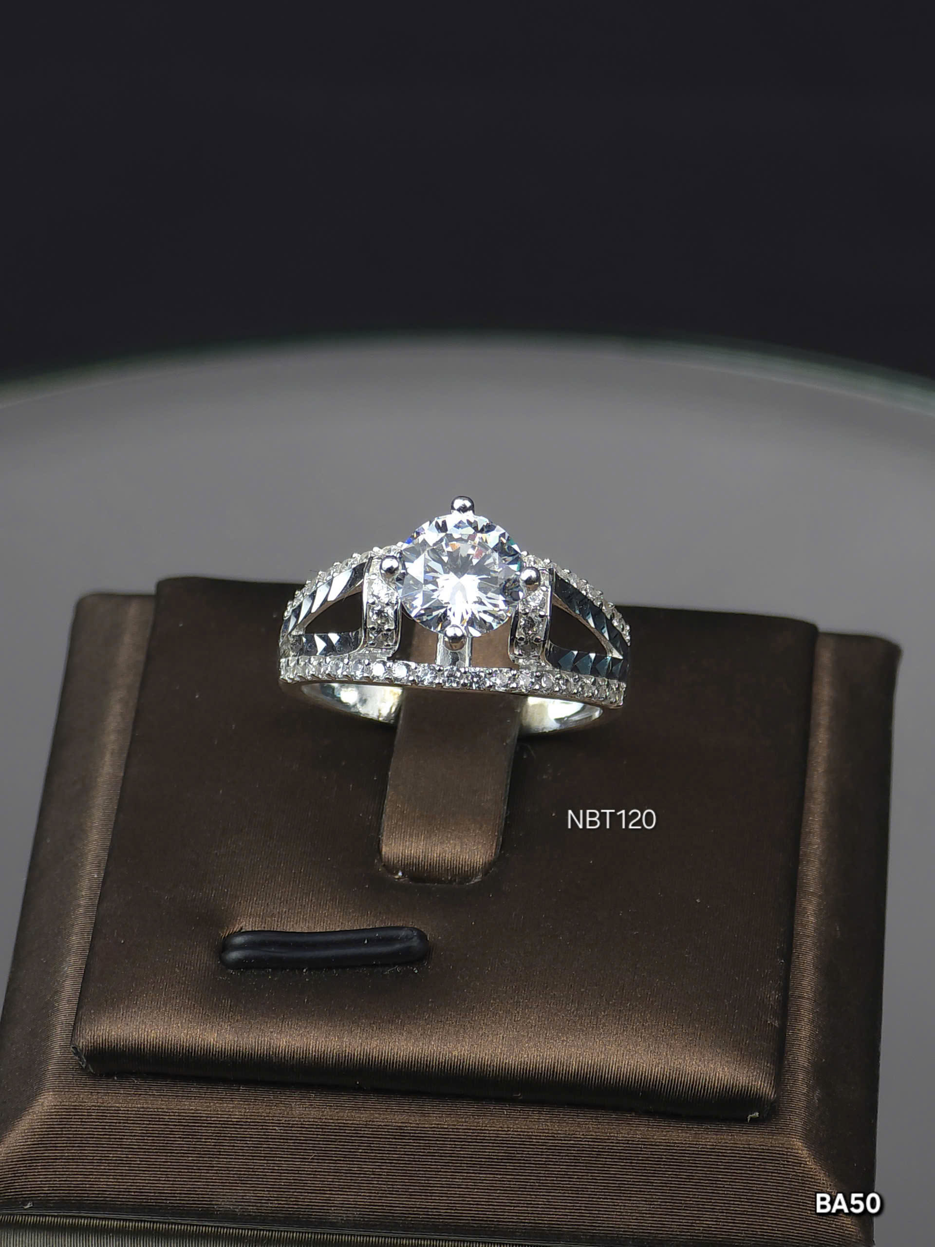 • Phần trung tâm: Nổi bật với viên đá lớn hình tròn, được cắt gọt tỉ mỉ theo kiểu giác cắt kim cương, lấp lánh rực rỡ dưới ánh sáng. Viên đá được giữ chắc chắn bởi bốn chấu kim loại, tôn lên vẻ đẹp tinh khiết của nó.