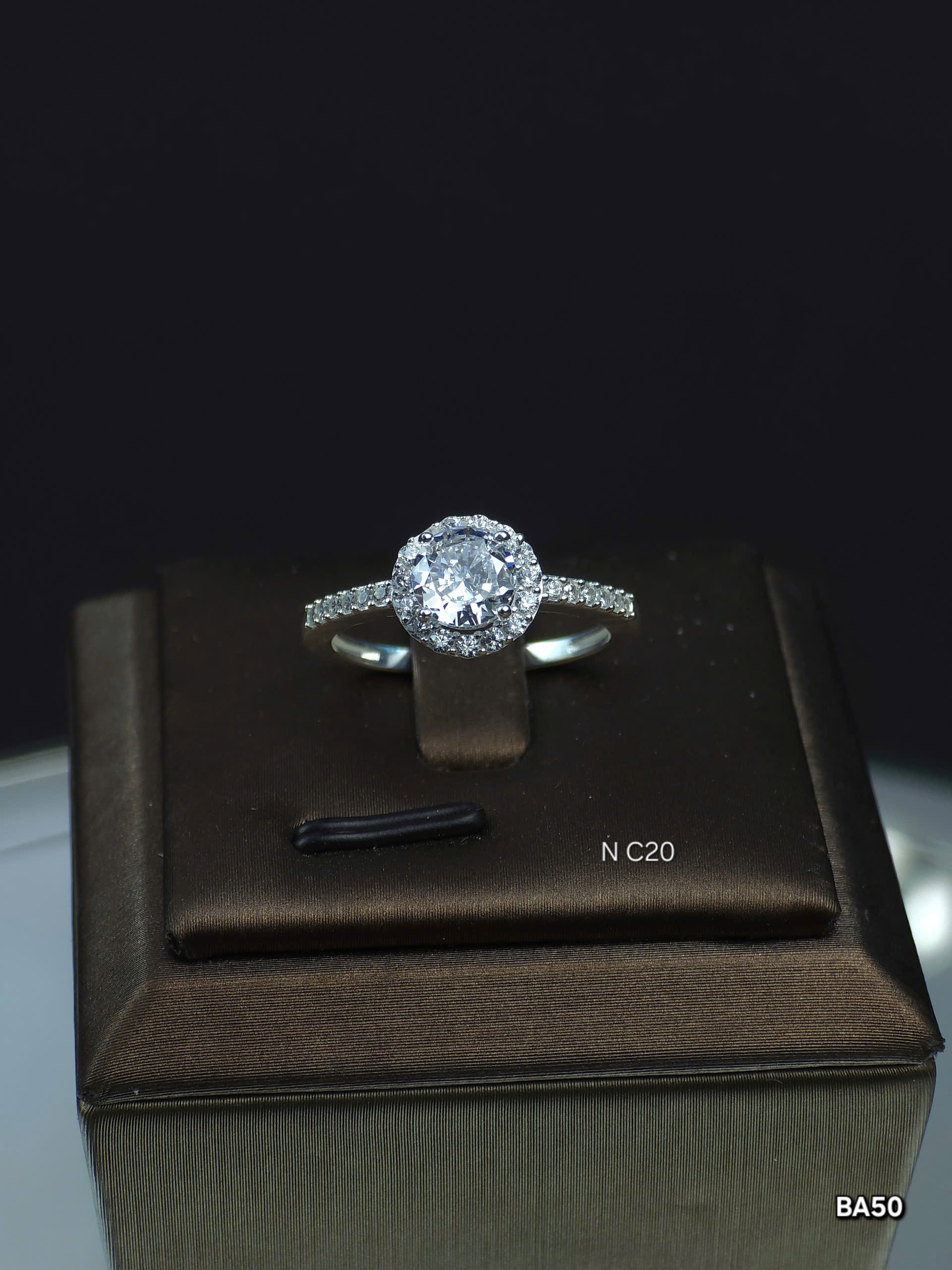 Ở trung tâm là viên đá chính hình tròn, được cắt tỉa tinh xảo, phản chiếu ánh sáng mạnh mẽ. Viên đá này được nâng lên cao so với mặt nhẫn, tạo điểm nhấn nổi bật. Bao quanh là một vòng đá nhỏ, ôm sát viên đá chính, làm tăng thêm vẻ lộng lẫy.