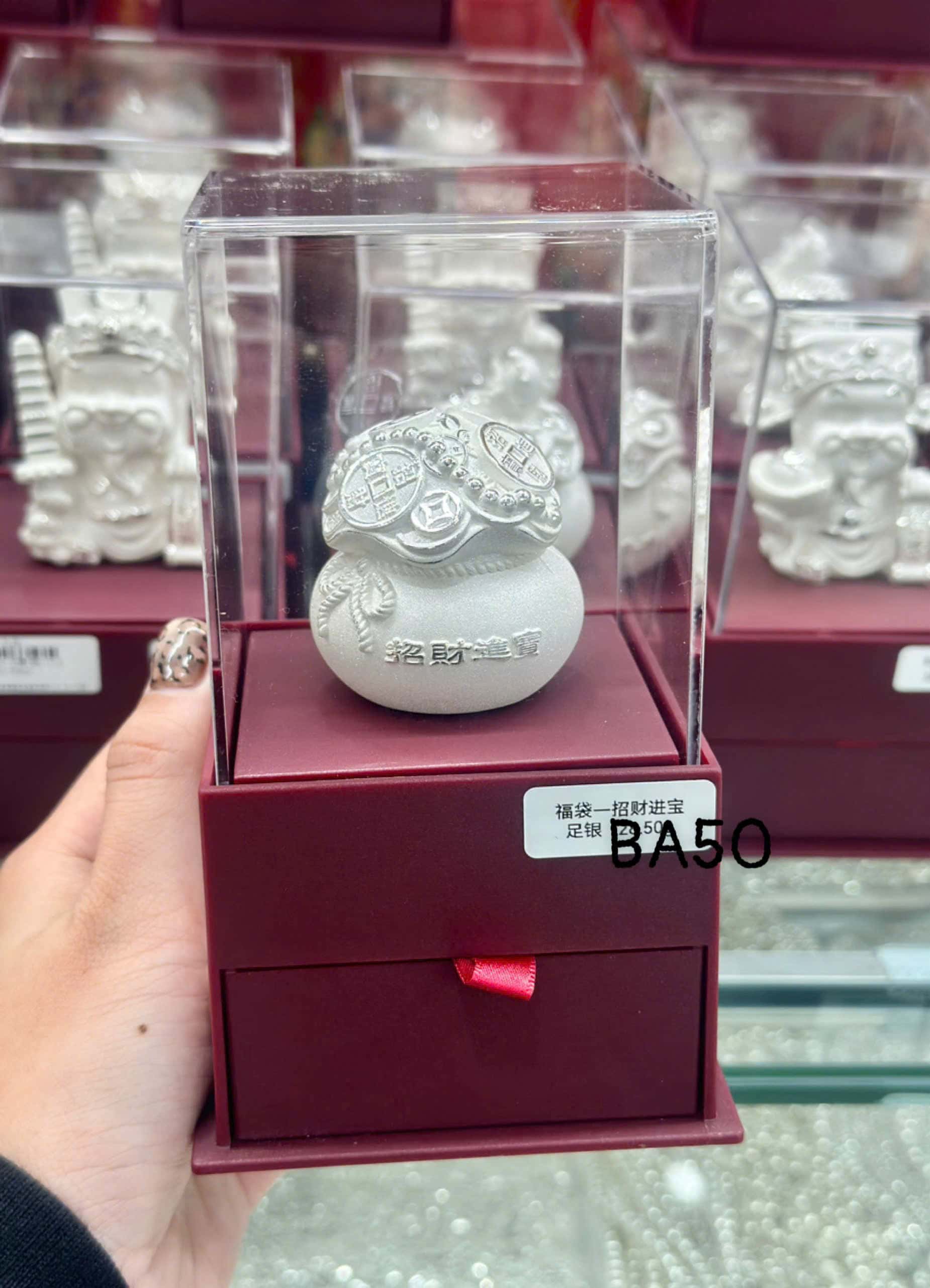 Sản phẩm được đóng gói trong hộp vuông màu đỏ đậm, sang trọng và lịch sự. Hộp có thiết kế hai tầng, phần nắp hộp có tấm kính trong suốt, giúp bảo quản và trưng bày vật phẩm một cách hoàn hảo. Tượng bạc phong thủy túi tiền tài lộc là món quà ý nghĩa, phù hợp để tặng người thân, bạn bè hoặc tự sử dụng để mang lại may mắn và thịnh vượng.