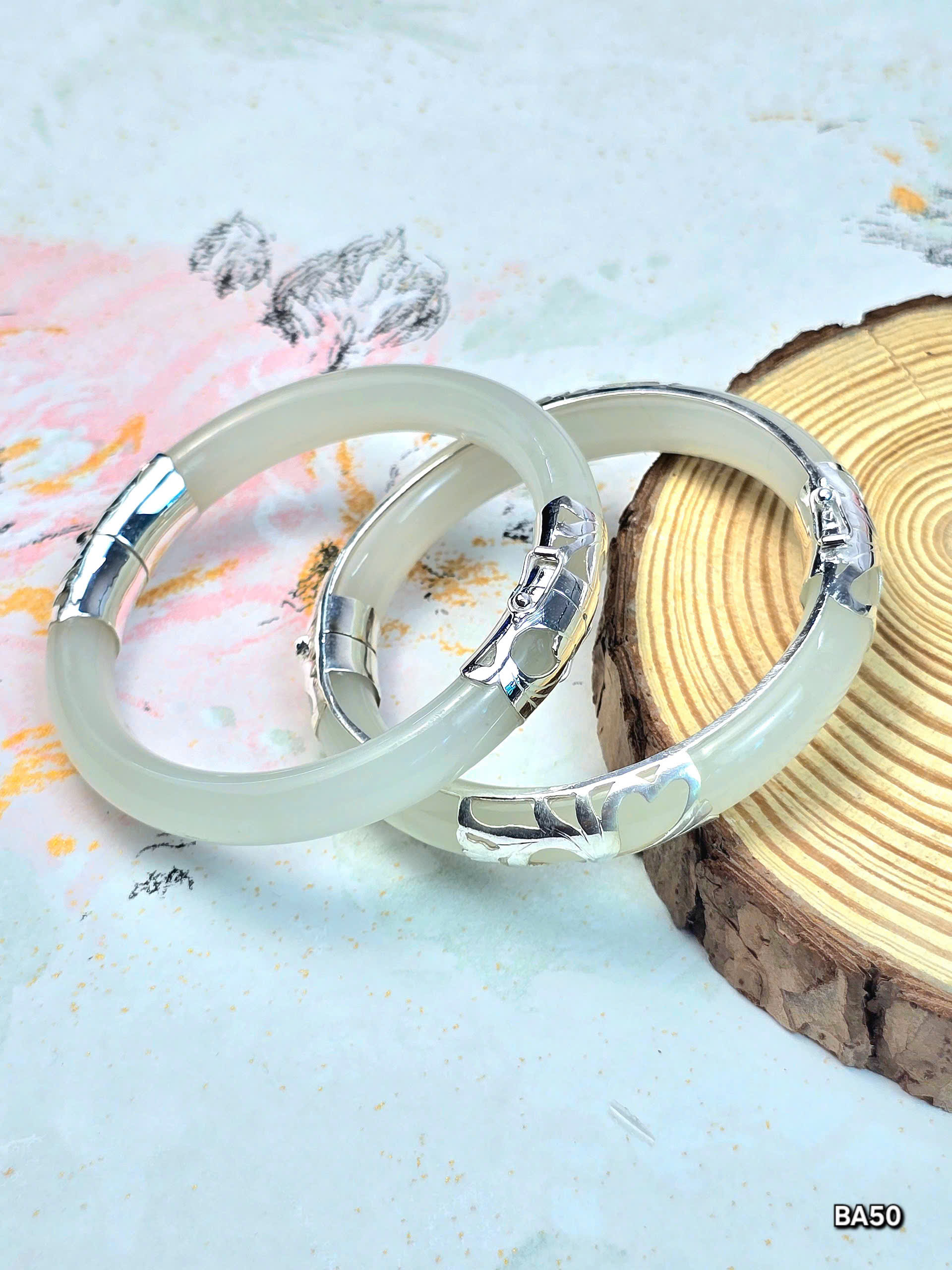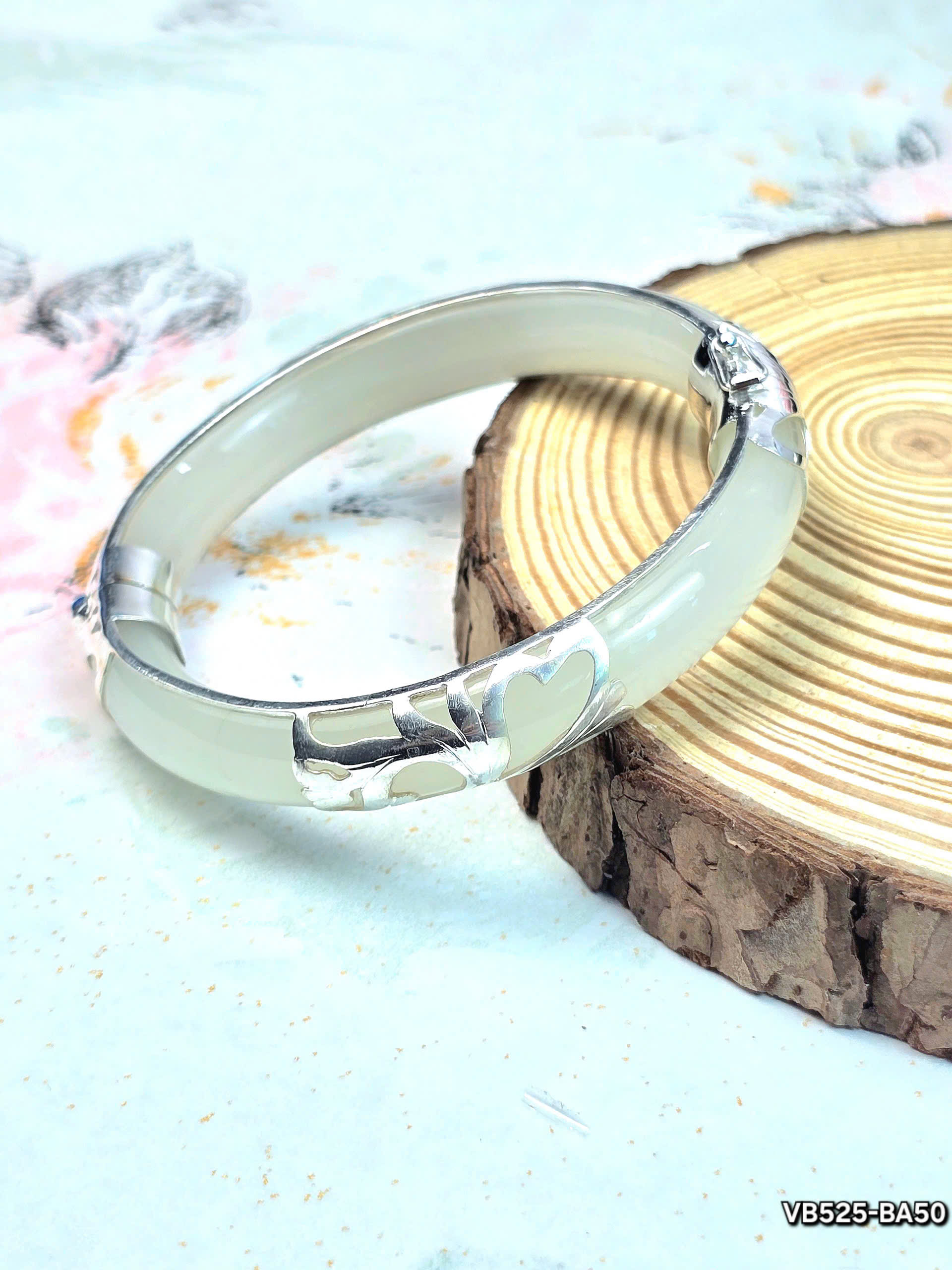 Khám phá vòng tay ngọc bọc bạc với thiết kế tinh xảo, kết hợp ngọc trắng ngà và bạc sáng bóng. Món trang sức thanh lịch, phù hợp mọi dịp.