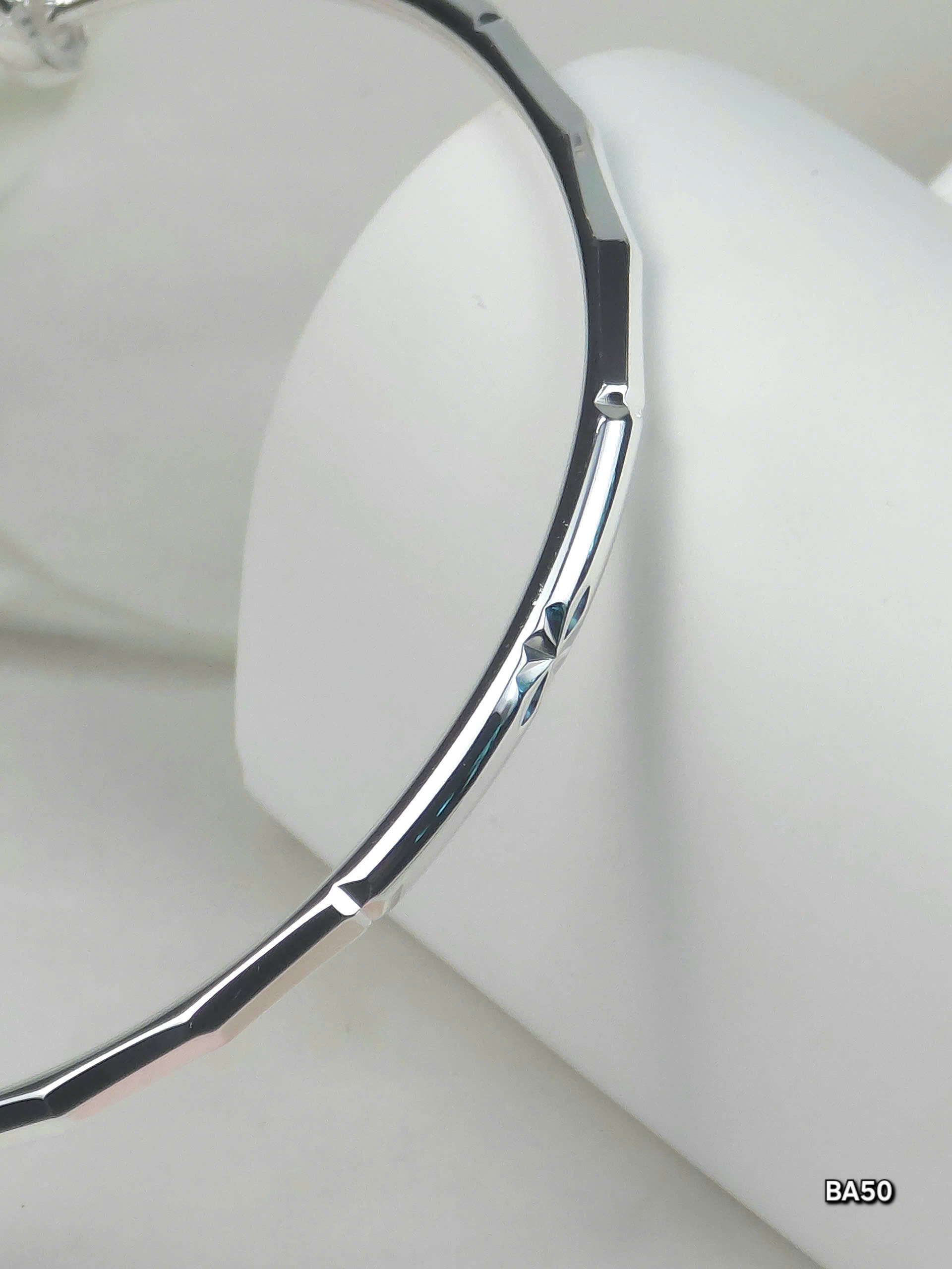 Vòng tay có độ rộng vừa phải, mảnh mai, ôm sát cổ tay, mang lại cảm giác thoải mái mà không hề nặng nề. Màu sắc trắng sáng đặc trưng của bạc, kết hợp với ánh phản chiếu, làm nổi bật vẻ đẹp của chiếc vòng dưới mọi ánh sáng. Đây là món trang sức lý tưởng để đeo trong các dịp dự tiệc, làm việc hoặc bất kỳ sự kiện trang trọng nào, giúp tôn lên vẻ đẹp và sự sang trọng của người phụ nữ.