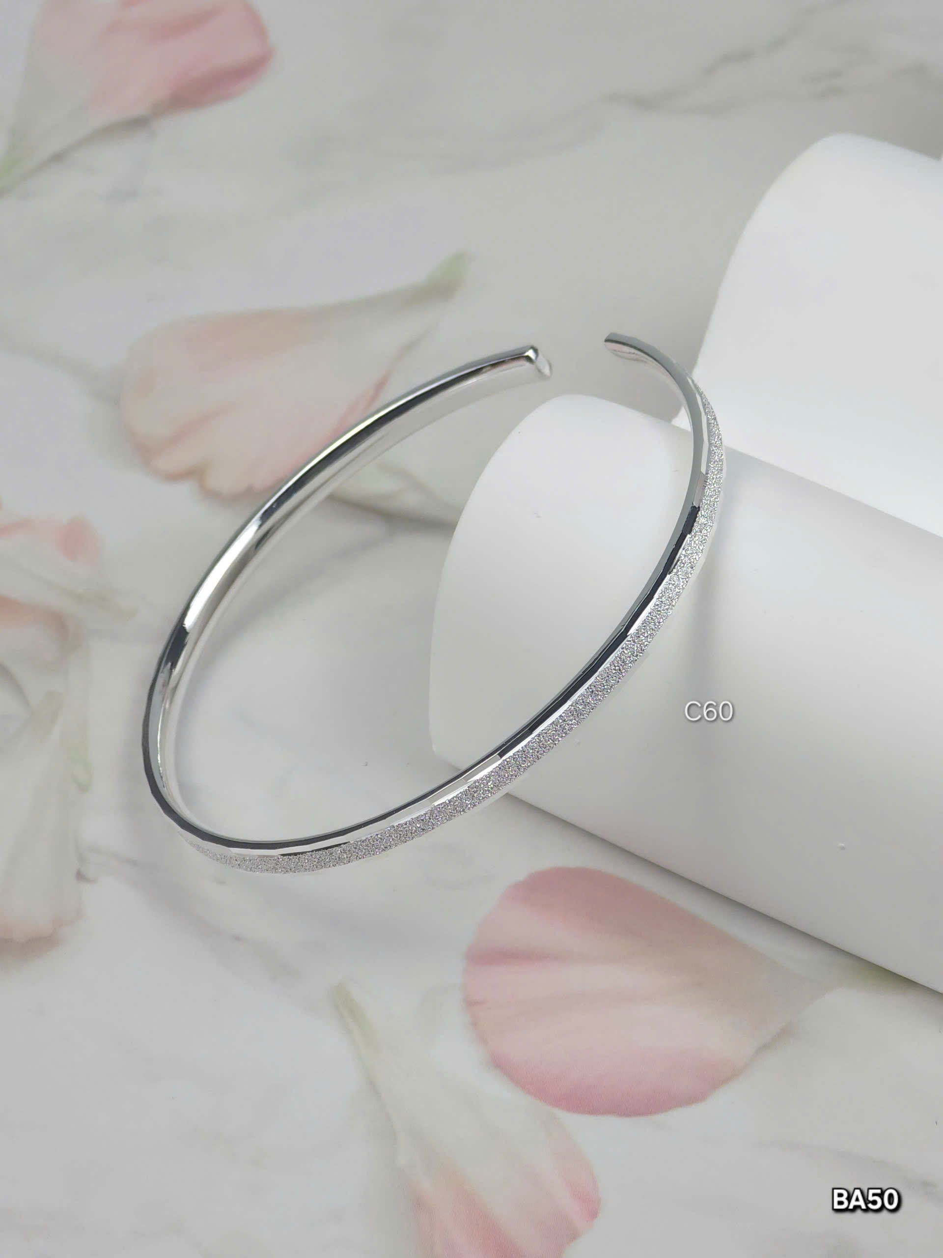 Bề mặt vòng được thiết kế với hai phong cách: một phần sáng bóng, nhẵn nhụi phản chiếu ánh sáng nhẹ nhàng, và một phần nhám mịn với họa tiết giống như những hạt cát lấp lánh, tạo hiệu ứng ánh sáng lung linh. Kích thước nhỏ gọn và thanh mảnh của vòng tay phù hợp để làm phụ kiện trang trí cho cổ tay, mang đến nét nổi bật mà không quá cầu kỳ.