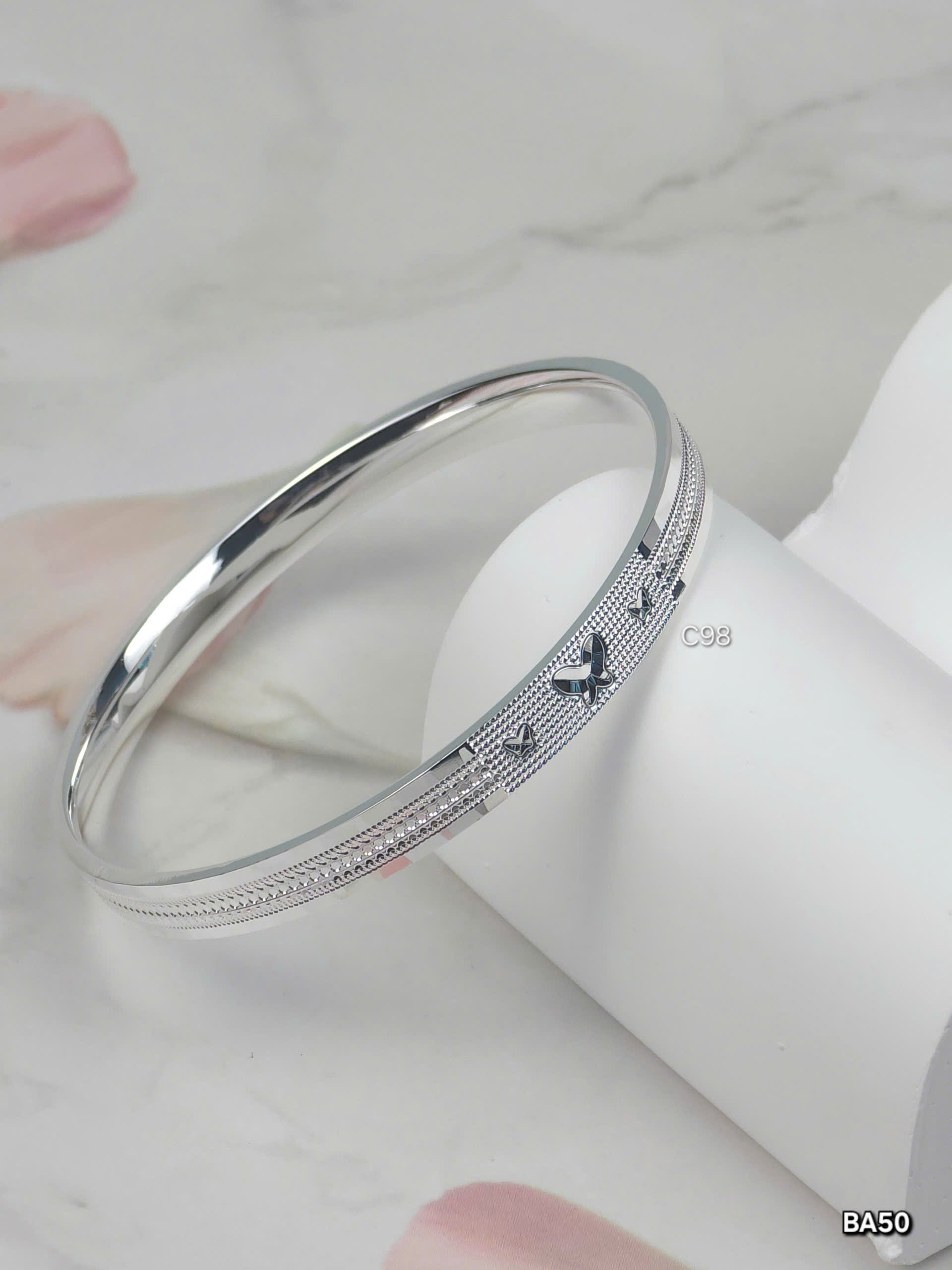 Vòng tay bạc nữ từ bacvn.com là sự kết hợp hoàn hảo giữa chất liệu bạc cao cấp và thiết kế tinh tế. Vòng có dạng hình tròn, hơi cứng cáp, phù hợp với cổ tay người trưởng thành. Bề mặt bạc bóng sáng, phản chiếu ánh sáng tạo nên vẻ ngoài sang trọng và đẹp mắt.