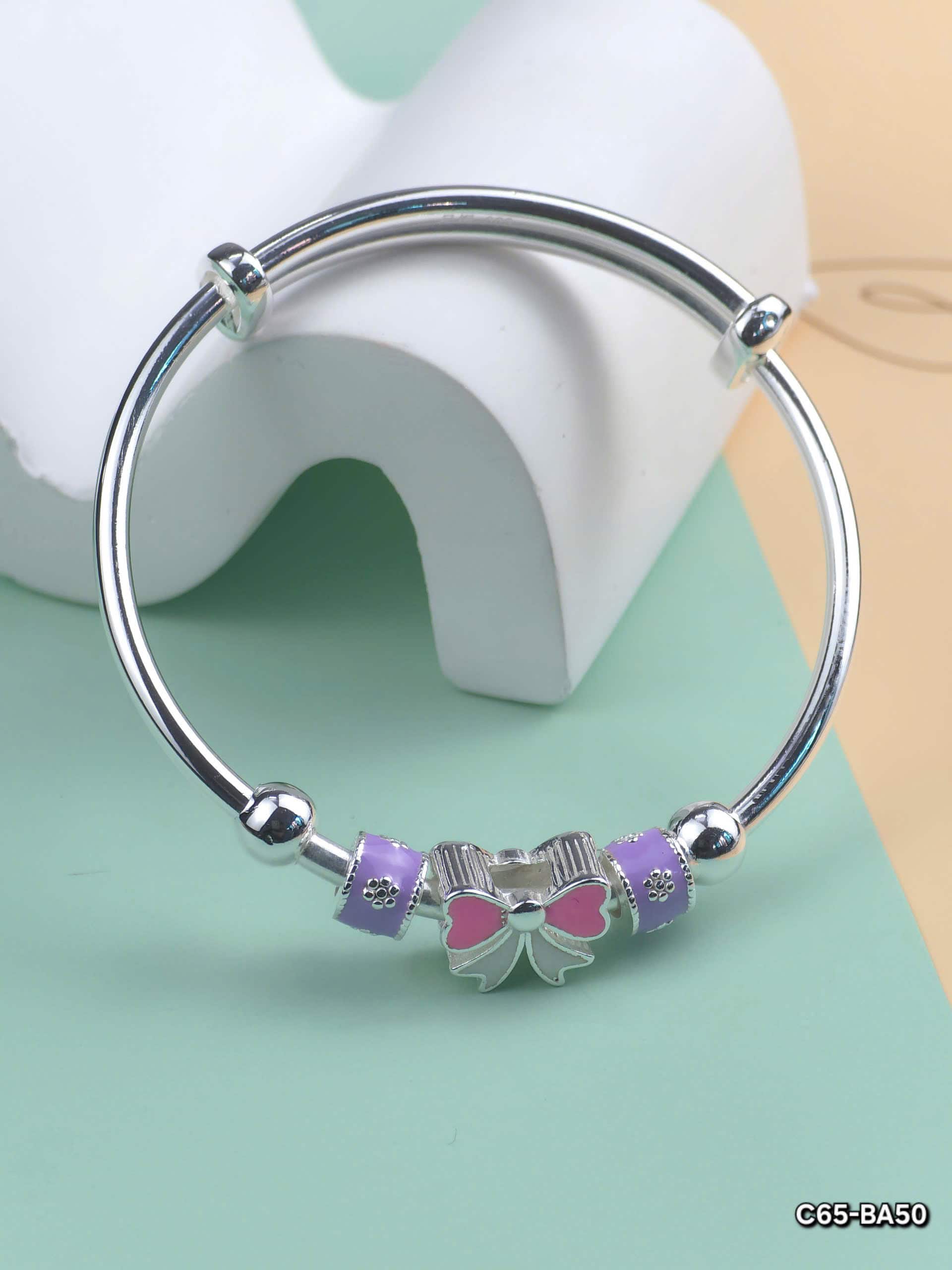 Điểm nhấn đặc biệt của vòng tay là bộ charm trang trí ở giữa, bao gồm hai ống trụ màu tím pastel với họa tiết hoa văn khắc chìm tinh tế, và một chiếc nơ bạc nổi bật với hai màu hồng và trắng. Chiếc nơ không chỉ làm tăng thêm sự duyên dáng mà còn mang đến nét cá tính độc đáo cho sản phẩm.