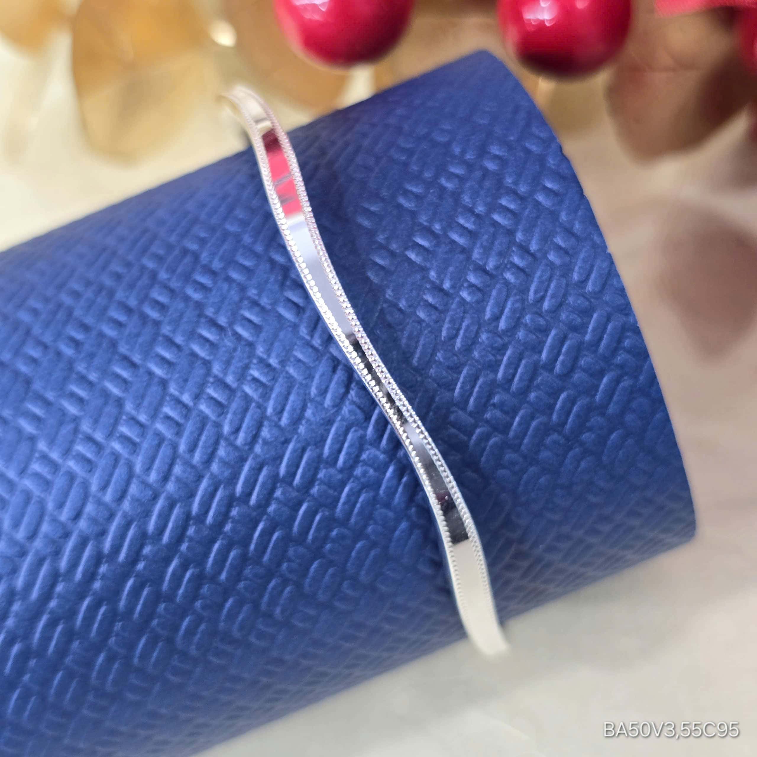 Vòng tay bạc tinh tế này được chế tác từ chất liệu bạc cao cấp, với khối lượng 3.55 chỉ, mang lại cảm giác nhẹ nhàng và thoải mái khi đeo. Thiết kế hiện đại với bề mặt trơn bóng lấp lánh, chiếc vòng tay thu hút mọi ánh nhìn từ mọi góc độ. Các đường kẻ nổi chạy song song ở mép vòng không chỉ tạo điểm nhấn riêng biệt mà còn thể hiện sự tinh xảo trong từng chi tiết. Vòng tay này phù hợp cho nhiều phong cách khác nhau, từ dịp đặc biệt cho đến những ngày thường, giúp tôn vinh vẻ đẹp của người phụ nữ. Sản phẩm không chỉ là một món trang sức, mà còn là một phụ kiện thời trang sẽ đồng hành cùng bạn theo năm tháng.