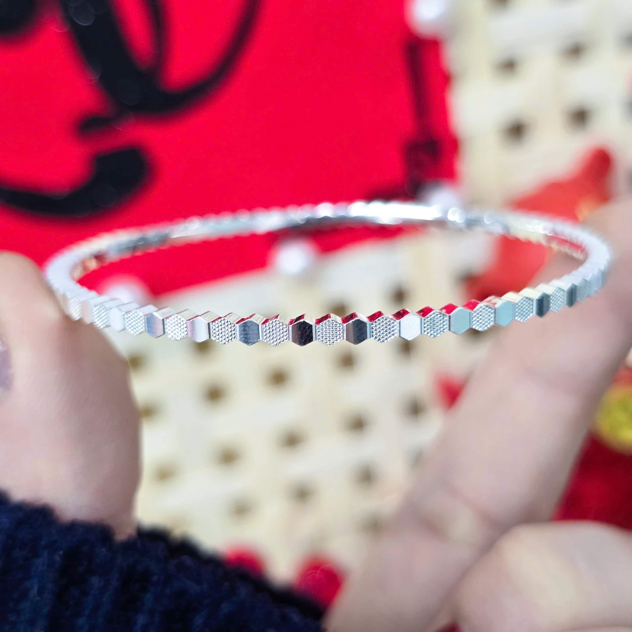 Chiếc vòng tay bạc tinh xảo với thiết kế lục giác độc đáo, mang lại vẻ đẹp sang trọng và thanh lịch cho người đeo.